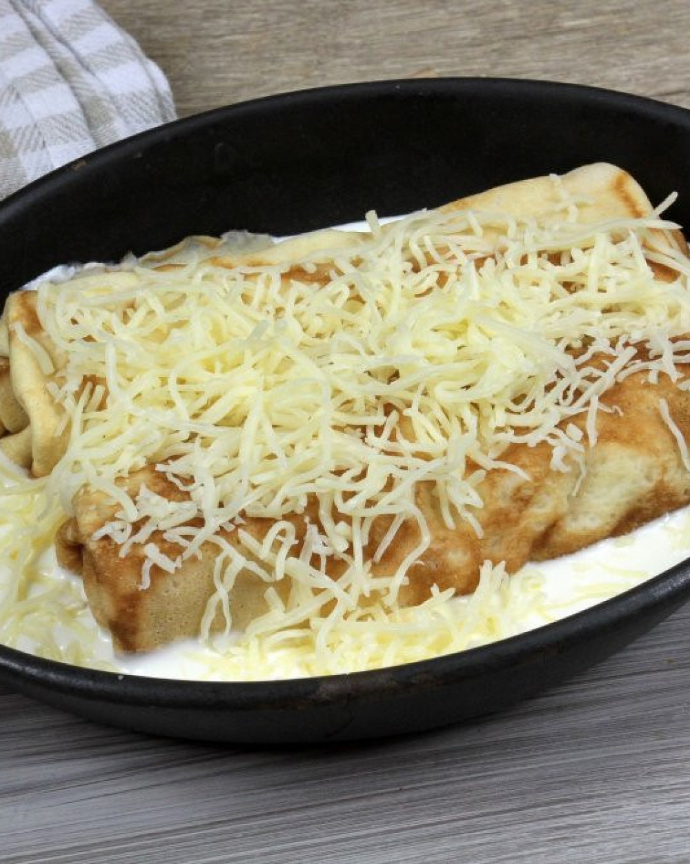 Crêpe garnie de jambon de poulet, crème de Maroilles et fromage râpé.