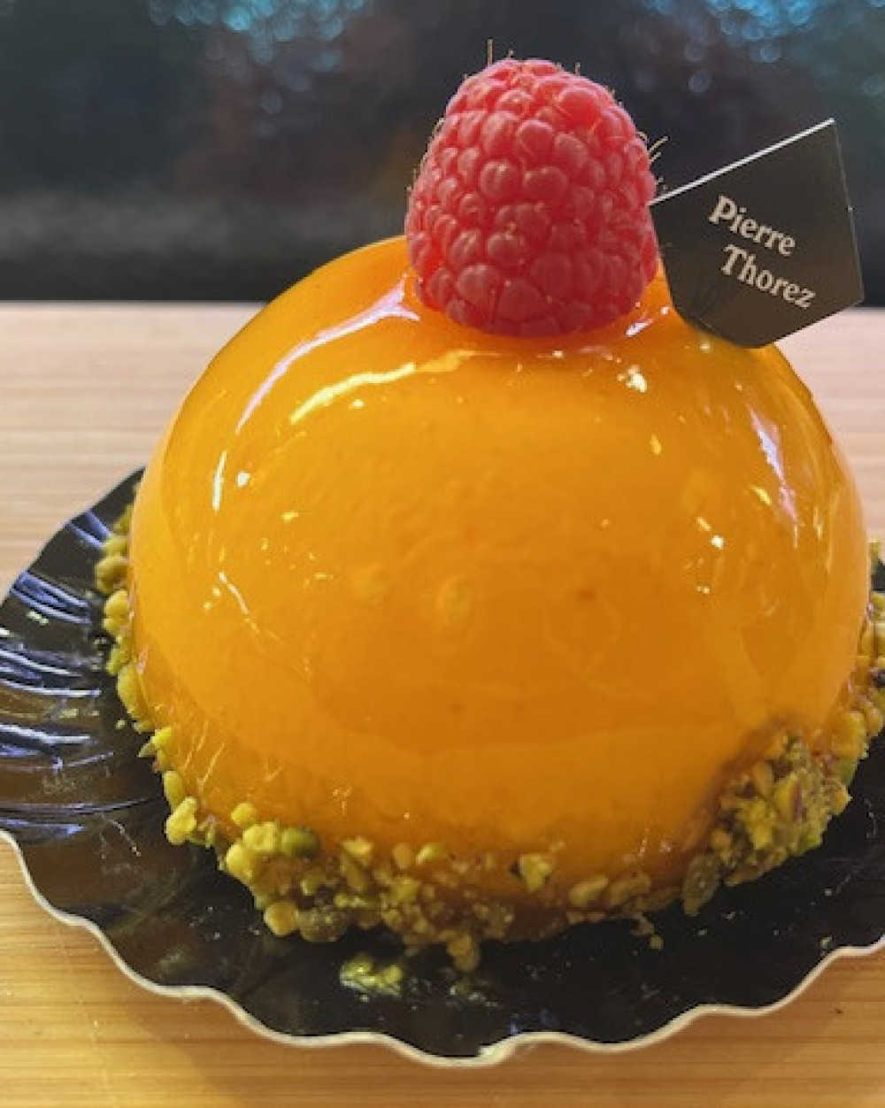 Mousse passion, crèmeux fraises, compotée de rhubrbe sur un biscuit moelleux pistache.